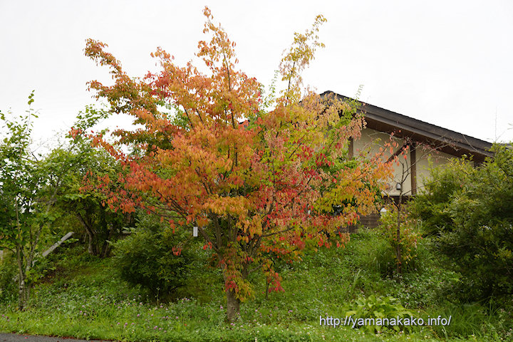 山中湖交流プラザきららの管理棟前にある木は、例年、早く色づき始め9月末頃には真っ赤になります。今年も写真のように色づきはじめてきたので、もう少し経つと真っ赤に染まってくると思います。この木以外はまだ青々としていて、見頃となるのは紅葉まつりが始まる10月の下旬ぐらいからかと思います。