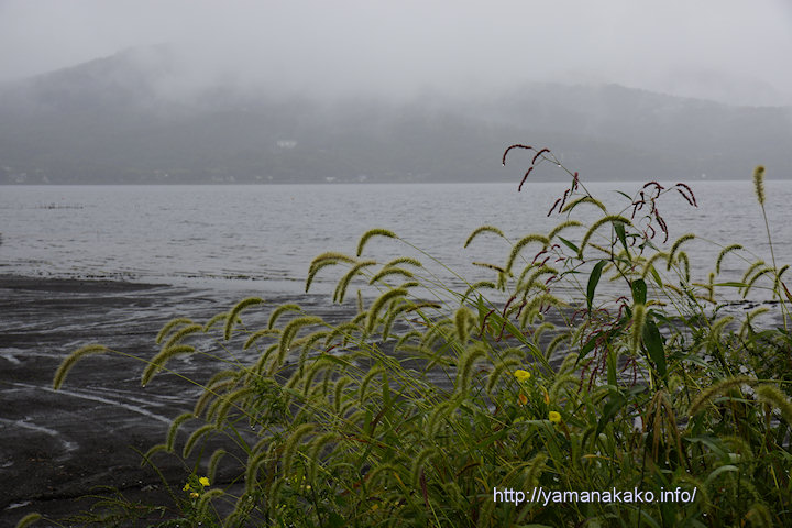 今朝の湖は雨に煙り対岸が霞んでいますが、波はあまりなく穏やかです。