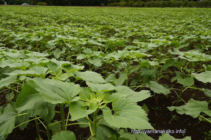 秋咲きひまわりの様子花の都公園では今年も秋にひまわりが咲くように種まきをし、写真のように育ってはいますが、台風や前線の影響で曇りがちの日が多く、晴れた日は少なくなっているせいか、背丈が低いままでつぼみが膨らんできてしまいました。この様子だと1mにも満たない内に開花してしまいそうです。