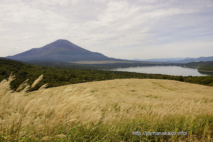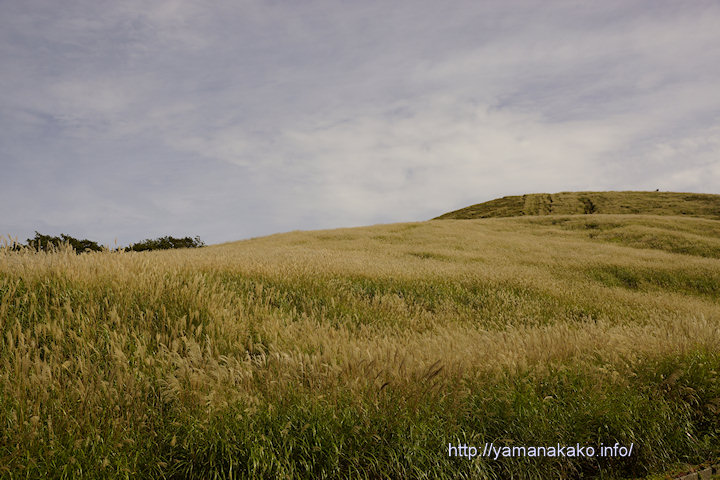 明神山のススキと富士山明神山のススキの穂が広がり、日に当たると黄金色に輝いてとてもきれいですが、撮りに行った時には日差しが弱くこんな感じとなってしまいました。これは県道から見た様子ですが、ススキの向こうに山中湖と富士山が見える絶景で、振り返るとこのススキが明神山山頂まで続いているのが見えます。