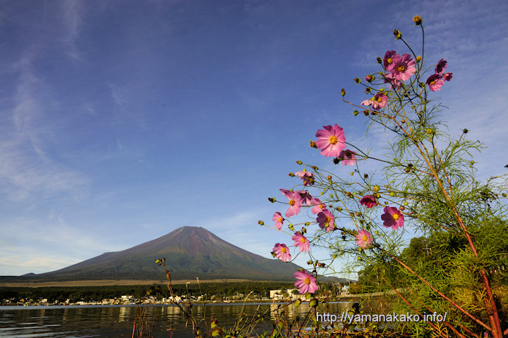 山中湖畔に咲くコスモス台風一過の青空が広がり、今朝は赤富士を期待しましたが、東の空にあった雲が厚く富士山は赤く染まりませんでした。東の空は赤く染まって山中湖は赤くなってきれいだったのに残念でした。
