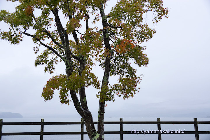 雨に煙る山中湖畔のモミジ今日は予報通り朝から雨が降っていて、対岸も薄ぼんやりとしか見えません。紅葉が遅れて青々としていた湖畔のモミジは、先週末の気温低下により色づき始めてきたように感じます。