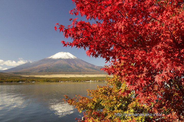 サイクリングロード沿いのモミジサイクリングロード沿いに、植えられているモミジの上側が真っ赤にそして下側はまだ緑で、ちょうどいい感じに染まっていました。今朝の湖は少し波立っていましたが、風がなければ逆さ富士も見られるかもしれません。