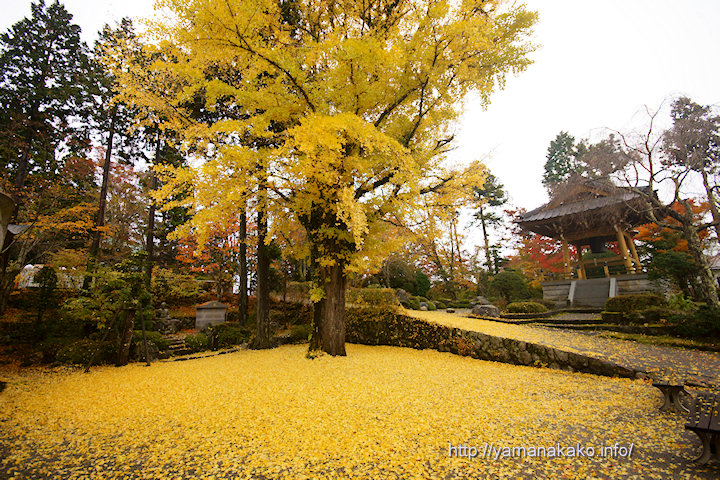 世界的オペラ歌手だった三浦環が眠る寿徳寺にある大イチョウの黄葉がピークを迎え、黄色い落ち葉の絨毯ができています。昨夜の雨でだいぶ葉が落ちましたが、まだ枝にもたくさんの葉が残っていてとてもきれいです。晴れていたらもっときれいかと思います。