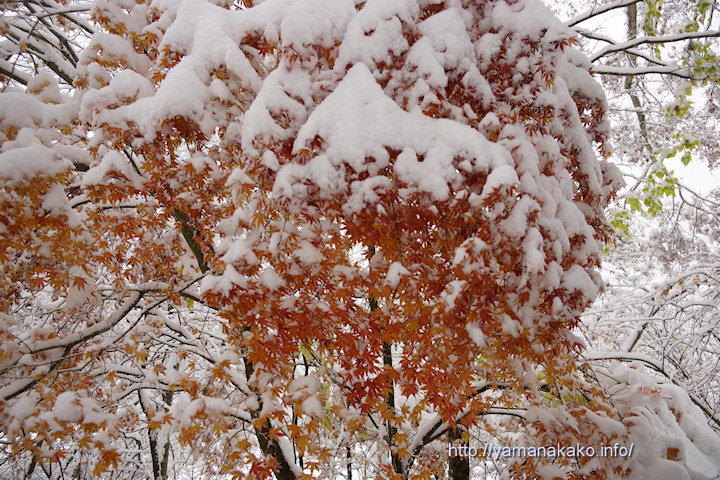 紅葉の上に積もった雪夜半過ぎから雪が降り始め、20cm程度積もりまだ降っています。11月に雪が降るのは非常にめずらしく、うろ覚えの記憶の中では18年ぶりかと思います。ただその時も1cm程度の積雪だったので、こんなに積もったのは初めてです。