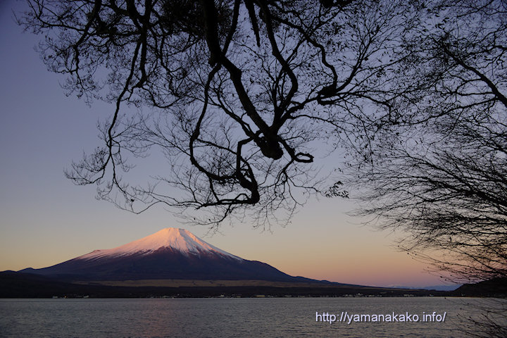 今朝は空気が澄んできれいな富士山が見られました。もう少し紅く染まるかもと思いましたが、ほんのりとピンク色になった程度でした。写真中央部のこの木は湖に向かって斜めに生えていて、枝の曲方が結構好きですが、何年か前の台風で太い枝が折れてしまい、少し迫力がかけるようになってしまいました。