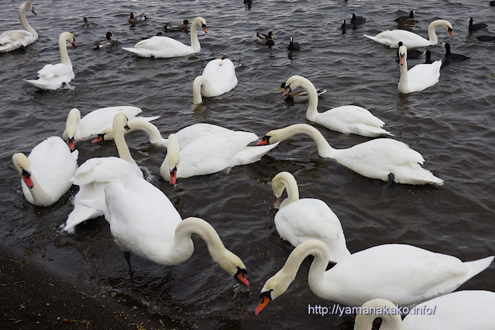 今日は晴れ予報でしたが、朝からどんよりと曇っていて、今にも雪が降りそうな空模様となっています。そんなわけで富士山は見えていませんので、今日は白鳥のエサやりの時間に立ち会ってきました。