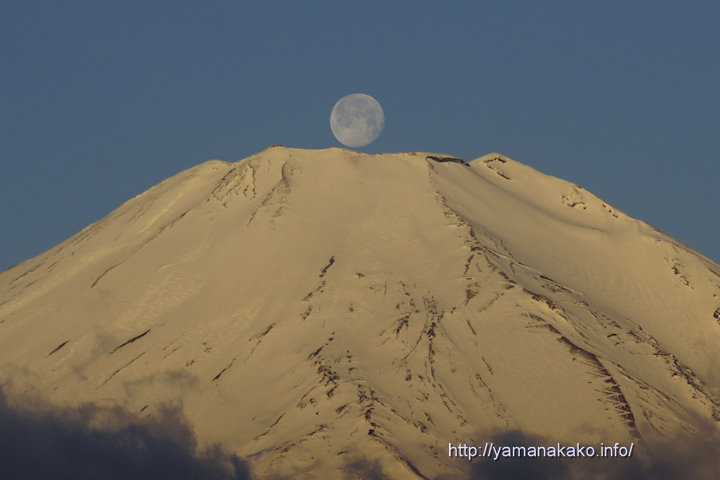 昨日は富士山に沈む月として投稿しましたが、今朝は山頂に沈む月(パール富士)が見られました。4時頃までは雲に遮られていましたが、だんだんと晴れてきて写真のように見ることができました。だいたい山中湖では3月〜8月に見られることがあるのですが、このように見られるのは、多くても年に数回なのでなかなか貴重です。