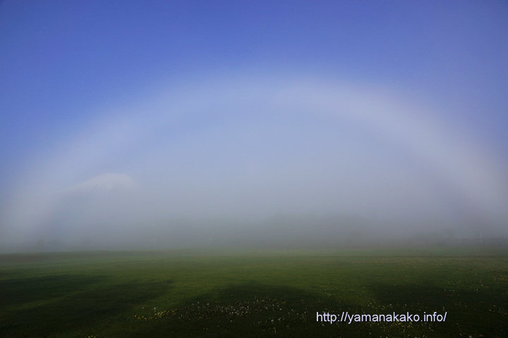 今朝の山中湖は霧に覆われていて雲海の中だったので、その霧が晴れる時に白虹が見られました。当初は平野湖岸で撮ろうかと思っていましたが、花の都公園に移動してしまったので、富士山は薄く左端に写っている程度となってしまいました。白虹と富士山を撮るのはなかなか難しいです。