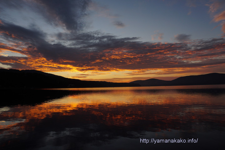 湖も染まる朝焼け今朝は雲が多めだったので、富士山を背に東の空が見られるところに行って、朝焼けを狙ってみました。案の定、空はオレンジ色に染まり、きれいな朝焼けとなりました。しばらくここにいて、振り返ると富士山頂も赤くなっていたので、慌てて移動してみましたが、きれいな赤富士には間に合いませんでした。残念。