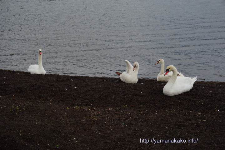 今朝は雨が降ったり止んだりのあいにくの天気の中、湖畔でくつろぐ白鳥が4羽いたので、近づいてみると6月10日に孵化した2羽の子どもたちとその親鳥でした。ずいぶんと大きくなり親子の差がわかりにくくなっていますが、親と子がわかるでしょうか。