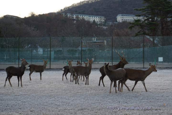 9頭の鹿今朝、道を走っていたら鹿の群れを見かけたので、車を駐めて撮ってみました。ちょうどテニスコートの金網が張ってあって、向こう側に逃げられない状況だったので、比較的近くから9頭の写真を撮ることができました。夜間・早朝は鹿が道路に飛び出てくることもあるのでご注意ください。