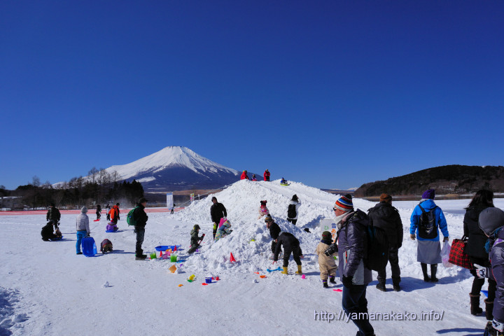 本日より2月18日まで「山中湖富士山雪まつり」が、山中湖交流プラザきららで開催されています。今日は風が強く寒い会場でしたが、子どもたちは元気にソリ滑りや雪遊びをしていました。