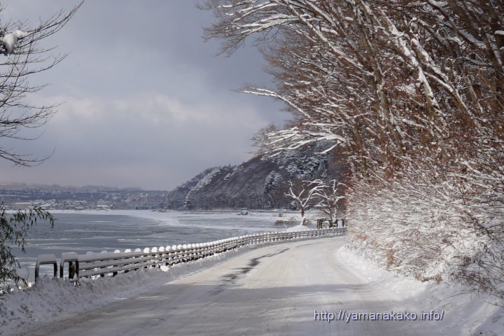 左側に見える湖の上も氷に雪が積もり、白くなっているのがわかります。ただこの辺りで凍っているのは岸側だけで、フレーム外の左側の沖は凍っていません。