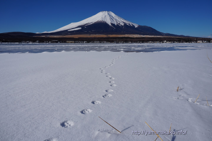 雪原に続く足跡人の足跡がない雪原に動物の足跡が湖畔まで続いていて、見た感じだと湖畔からこちら側に向かってきているような感じでした。足跡は浅くここは日当たりのよい場所ですが、まだ20cm以上の雪が残っていました。