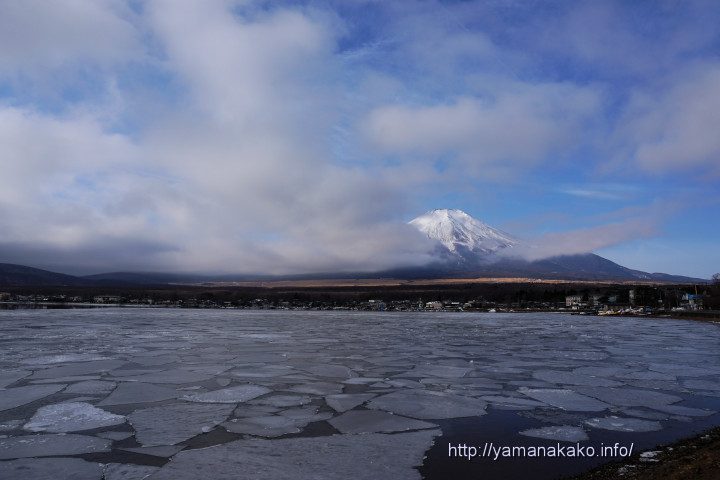 一昨日まで山中湖のかなりの広範囲を覆っていた氷ですが、ずいぶんと面積は狭くなり、昨日の朝はこの場所に氷はなくなっていましたが、今朝はまた写真のようにたくさんの氷が漂着していました。
