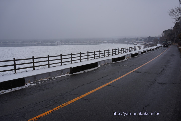 午前9時頃の道路状況明け方から少し雪が降り、写真のように湖にある氷やサイクリングロードは真っ白になっていました。脇道や日陰の道路では白くなっている箇所もありましたが、日なたや国道は濡れている程度で、白くはなっていませんでした。