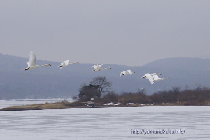 今日はめずらしく平野地区の氷の上に白鳥がいて、それを撮っていたらまた別の6羽が飛んできました。いつもは大池地区にたくさんの白鳥がいるのですが、今日は平野地区に多く集まっていました。