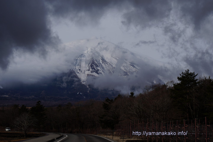 朝から雨が降ったり止んだりで強い風が吹いていて春の嵐となっています。9時頃には写真のように富士山の山肌が見えましたが、すぐに灰色の雲に遮られて隠れてしまいました。