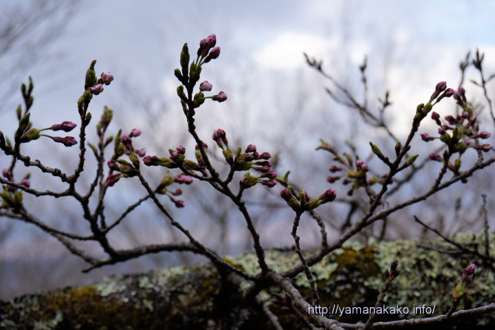 いつも桜の開花定点観測している場所の近くにある富士桜が、写真のように咲き始めました。といってもほとんどがまだつぼみで、咲いているのはほんのわずかとなっています。