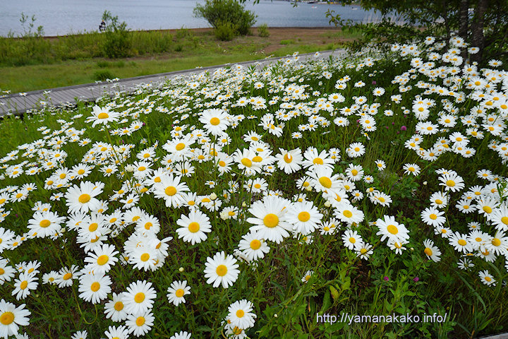 山中湖交流プラザきらら前には、毎年たくさんのフランスギクが咲くので、今年もそろそろかと見に行ってみましたが、今年はちょっとだけでした。きららができる前は、この辺り一面がフランスギクに埋め尽くされていて、2002年の富士山にある6月9日の写真が、現在のステージ横の楽屋棟辺りから撮ったものだと思います。