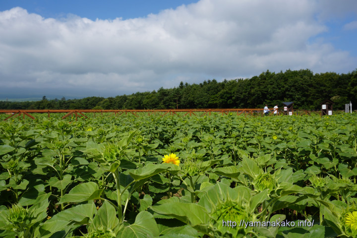 ひまわり咲き始め23日に投稿したひまわり畑ですが、さらに成長し2mぐらいに成長して、開花したものも見られるようになりましたが、明日は台風が最接近するようで心配です。せっかくここまで育ったので、なんとか満開になってほしいものです。