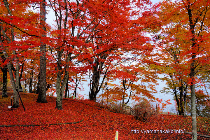 今日も紅葉ネタですが、旭日丘湖畔緑地公園の紅葉は後半戦になり、昨日の山中諏訪神社境内のように遊歩道が落ち葉で埋まっていました。ただこちらは赤い葉で、まだ葉が落ちきらないので、上も下も真っ赤になっていました。明日になるとこの木の葉も落ちてしまうかもしれません。紅葉の様子は山中湖紅葉情報をご覧ください。