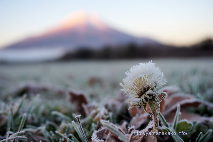 霜の花・・・タンポポ今朝、花の都公園では霜が降りて辺り一面真っ白でした。よく見てみるとタンポポはまた花が咲いているような感じになっていました。