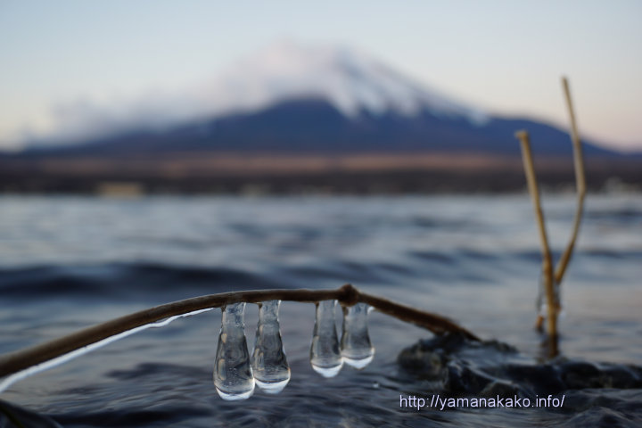 例年だと湖畔にいろんな形をした氷の造形物ができますが、今年はあまり寒くならないので、山中湖結氷ということはなく湖の縁が少し凍るだけで、氷の造形物もあまりできません。今朝は少し風があったので、波によって写真のような氷の滴という感じのものができてましたが小さめでした。