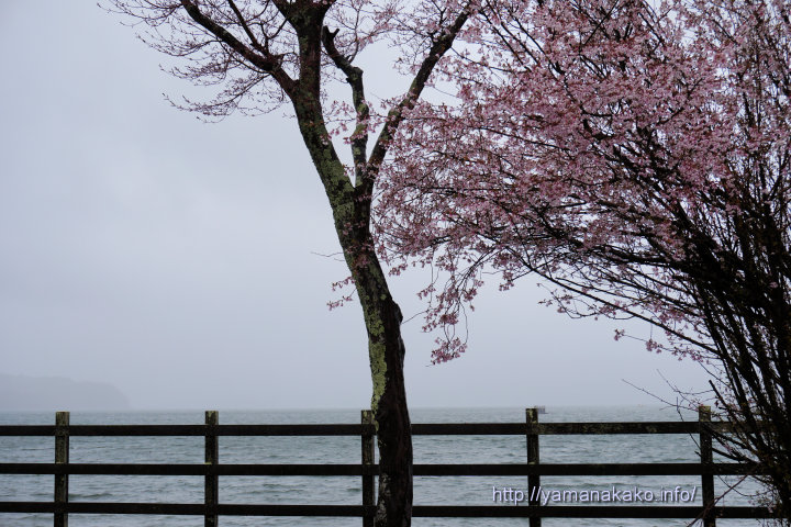 昨夜から雨が降り続いていて、雨に煙り対岸は見えません。ここの桜はまだ満開ですが、この雨でだいぶ散ってしまいそうです。一昨日(28日)はいい天気だったので、富士山と桜が見られましたが、次に晴れる時はもう桜はないかもしれません。