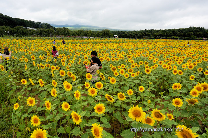 9日に掲載した花の都公園のひまわりが満開となって、連休は多くの人で賑わい、今朝も富士山は見えていないものの多くの人が訪れていました。こんなにきれいに咲いているので、台風の影響は受けずにいてもらいたいものです。
