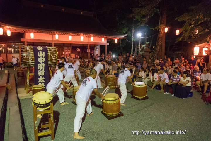 山中明神太鼓納涼打ち込み昨夜、山中明神太鼓納涼打ち込みが、山中諏訪神社境内で行われました。13日から15日の毎夜20時から行う予定ですが、台風10号影響の降雨により、今日明日は中止になってしまうかもしれません。降らなければいいがどうでしょう。