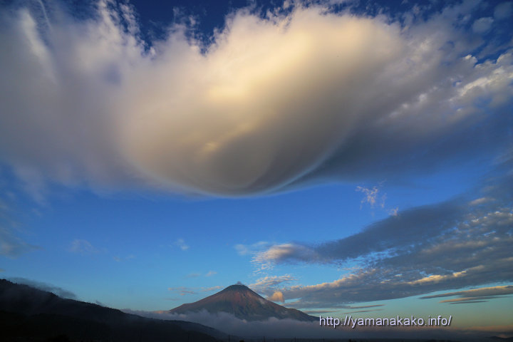 日の出前は山中湖畔からも富士山が見えていましたが、だんだんと雲に遮られて見えなくなってしまい、大きな吊し雲が出ていてフレームに収まりきらなかったので、忍野に行って撮ってみました。なかなか大きく立派な吊し雲で、刻々と変化していました。