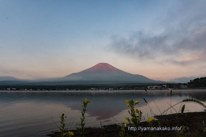 今朝は少しもやっていましたが、富士山に近い湖畔からは写真のように見えました。夏の間、湖畔にたくさん咲いていた待宵草も少しだけになり、季節の移ろいを感じます。
