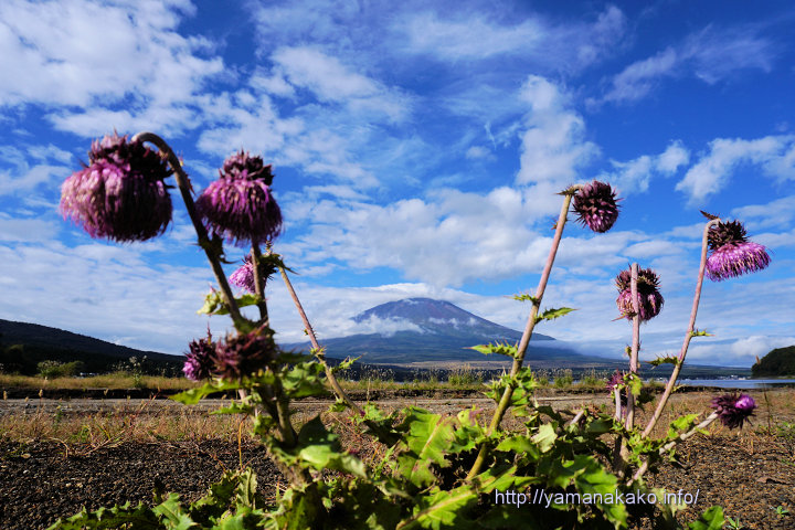 きらら前のフジアザミと富士山8時過ぎは青空が広がってきて晴れていたので、きらら前のフジアザミを撮ってみました。9月20日に投稿したように今年は大きな株がなく、咲いているのはこのぐらいの大きさで、ちょうど今がピークといった感じです。