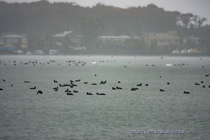 国道を走っていて、ふと湖に視線を移すと、たくさんの黒い点が浮かんでいたので、カモかもと思って湖畔からよく見てみると、真っ黒な体に白いくちばしでした。見た限りではまだカモは飛来していないようで、オオバンだけで遠くに白鳥が2羽見えました。