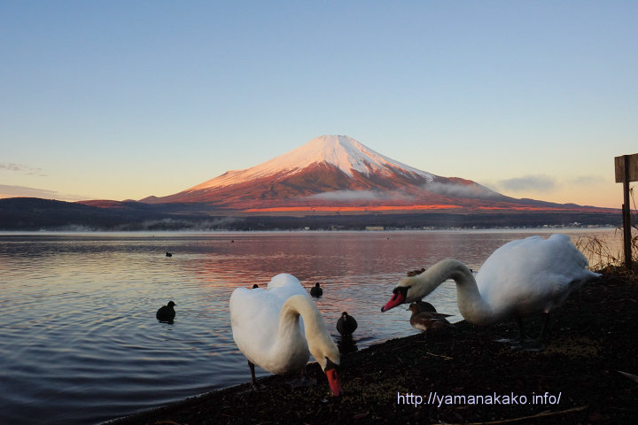 えさを食べる白鳥と富士山今朝は富士山を撮っていたら、白鳥の朝食タイムになったので、かなり接近してみました。周りにはオオバンやカモがいて、白鳥のエサをびくびくしながら食べていてなかなか面白かったです。