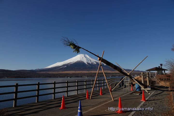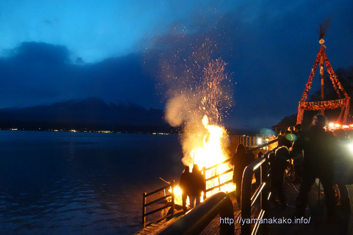夕方には各所で御神木が立ち、一番最後に朝紹介した長池地区の御神木が立ち、湖畔でどんど焼きが行われました。