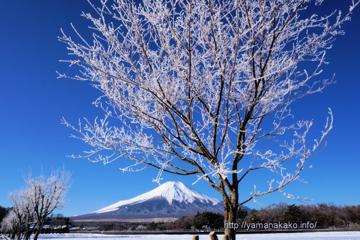 今朝は花の都公園内の木々が霧氷で真っ白になってとてもきれいでした。日が出て気温が上がってくるまでの短い間しか見られませんので、午前9時頃までの限定景色となります。
