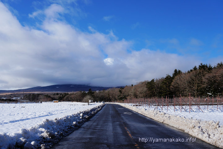 道路状況:山中湖周回道路に凍結はありませんが道幅は狭くなっています。その他の道路にはまだ残雪あり。