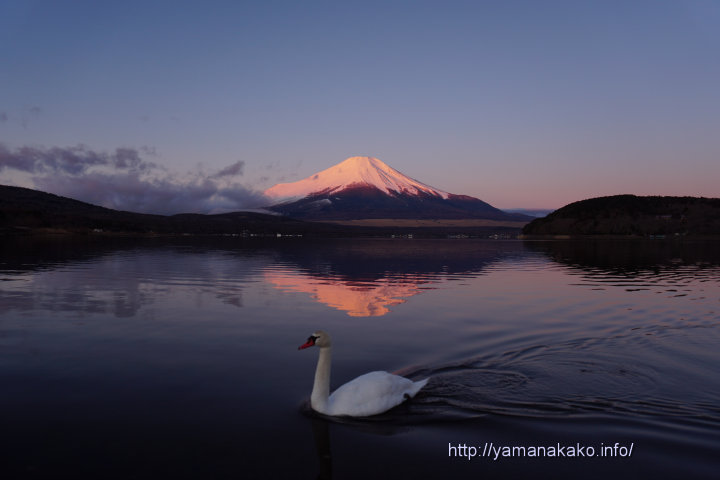 今朝の富士山は久しぶりに薄ピンク色に染まり、空気も澄んでいたのできれいに見えました。そして白鳥が近寄ってきて、フレームイン・・・
