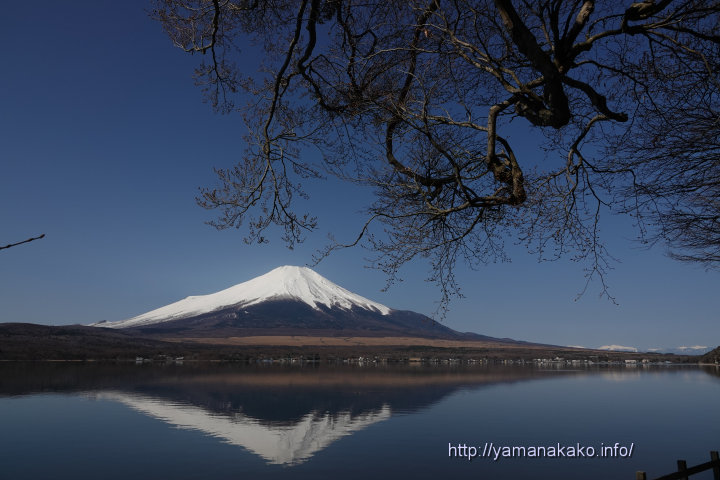 湖に張り出した枝の下から望む富士山