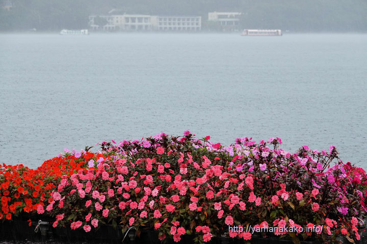 今日は雨なので、湖に浮かべられている花壇に植えられている満開のサンパチェンス越しに、対岸を撮ってみました。何艇か出ていたわかさぎ釣りドーム船も、雨に煙り霞んでいました。