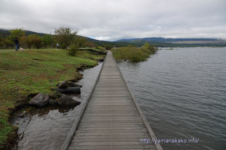 台風と前線の影響で木曜日から土曜日まで約250mmほどの雨が降り、山中湖はまた増水し、山中湖交流プラザきららの木道は水の中になってしまいました。