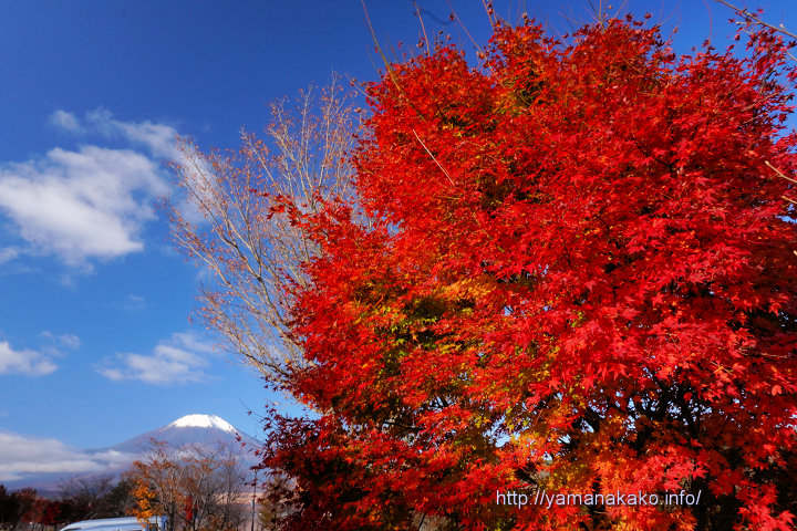 紅葉と富士山早朝は雲が多めでしたが、だんだんと晴れてきて青空が広がってきました。紅葉のピークは過ぎたような感じですが、まだ写真のように鮮やかに染まっている木もあります。紅葉が終わればモノクロームの世界になってしまうので、紅葉ネタはもう少し続く予定です(笑)。