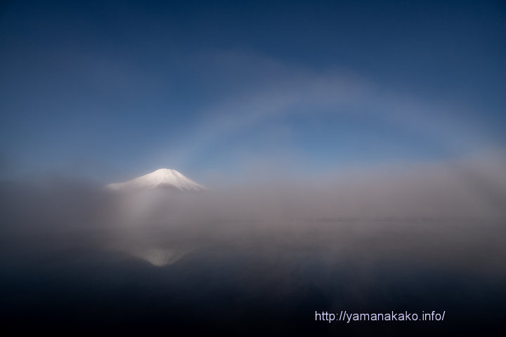 今朝の山中湖は霧で覆われていて、そのときは高台から雲海に浮かぶ富士山が見えました。そして霧が晴れる時には、写真のような白虹が現れます。すっきりと見られる白虹は滅多に現れませんが、きょうはまぁまぁきれいでした。