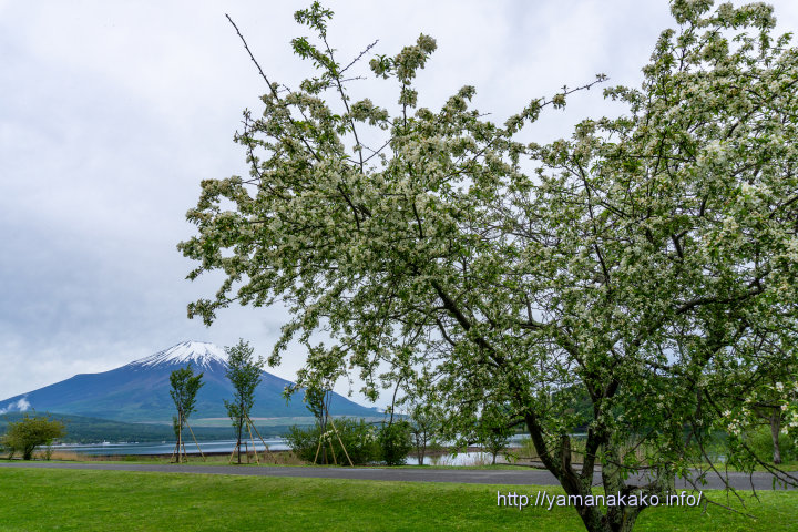 山中湖交流プラザきららのはらっぱにあるズミは、花が咲いて富士山が見えるときには、撮影ポイントとして人気がありますが、今年は木の右側半分に花がなく、サイクリングロード沿いに木が植えられたので、写真的にはいまいちな感じになってしまいました。