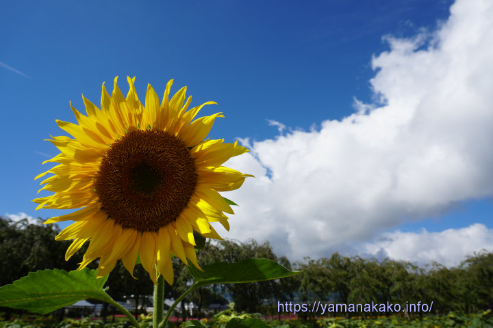 花の都公園のひまわり花の都公園のひまわりもほとんどが枯れてしまいましたが、中にはきれいに咲いているものもあり、青空が見えていたので撮ってみました。他の花も長雨でだいぶ痛んでしまいましたが、コスモスはまた復活してきました。なお、花の都公園の清流の里は12日(日)まで休園中です。