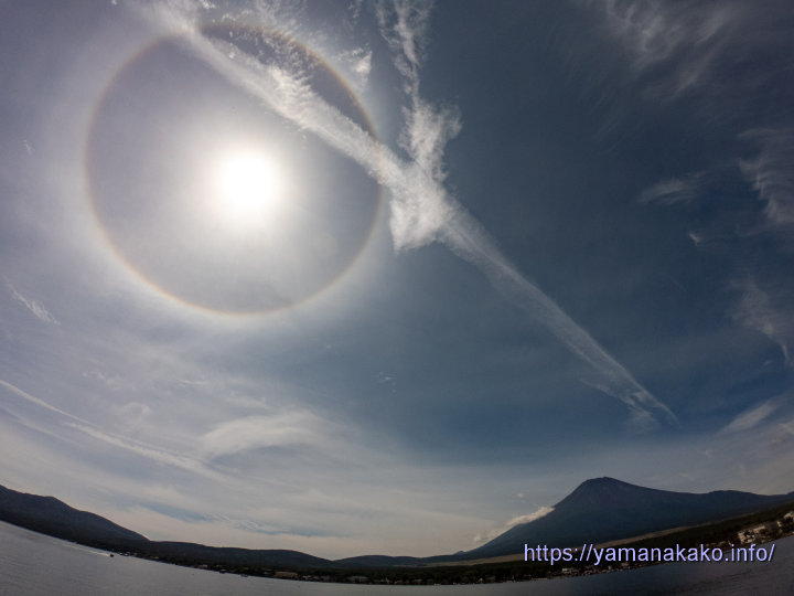 日暈と富士山今日は久しぶりに富士山が見られ、9月に入ってから全景が見られたのは初めてで、先日観測された初冠雪はもうすっかりなくなっていました。そして上空には薄い雲があったので、太陽の周りに大きな暈が見られました。超広角レンズなので歪んでます(^^;