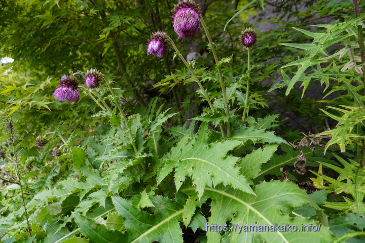 フジアザミの咲く頃になり、ままの森の下辺りのサイクリングロード沿いでは、写真のように咲いてきました。ただ今年は湖が増水したため、湖畔で咲くフジアザミは少なく、いつもはたくさん咲いて人気の写真スポットである山中湖交流プラザきららの浜でも、大きな株はなく小さな株が転々とあるだけです。